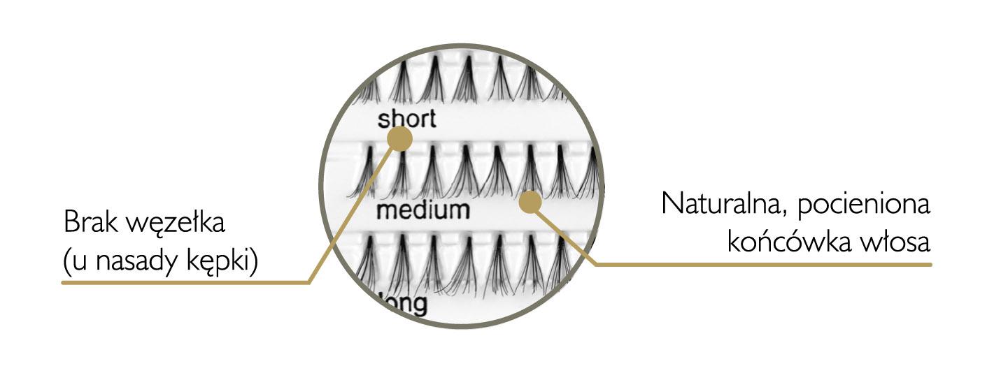 Kępki sztucznych rzęs – krótkie, cieniowane, czarne, bezwęzełkowe, stożkowe