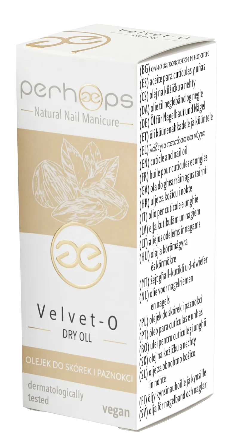 Łącząc w swoim składzie roślinne olejki oraz witaminę E, odżywia, nawilża i uelastycznia kruche, suche paznokcie i szorstkie skórki. Velvet-O natychmiast wchłania się, nadaje połysk i pozostawia subtelny zapach kokosa.